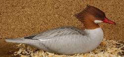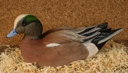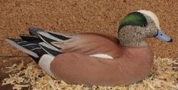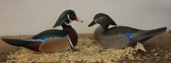 Wood duck pair, hand-carved from Maine white pine, cedar head, hollowed and painted with acrylic paints. Life size and made as a hunting decoy with a bottom weight and leather anchor rode attachment loop. $400/pair plus shipping |